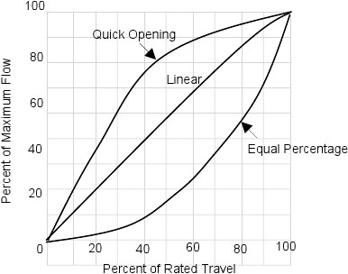 在一個阻塞流和閃爍控制閥的速度和壓力分布。圖片來源:前澤。 流量特性:閥容量和閥門的行程之間的關(guān)系。它通常是用曲線的形式表示。控制閥有兩種類型的特征:內(nèi)在的和安裝。固有的特征是來自測試閥以水為流體和一個恒定的閥門的壓降。當(dāng)閥門安裝在系統(tǒng)水泵,管道及配件,壓力下降在閥將與旅行改變。當(dāng)在一個系統(tǒng)的實(shí)際流量與閥門開度,該曲線稱為安裝流量特性。閥門可以通過塑造插頭孔或籠,以產(chǎn)生一種特殊的曲線。閥門的特點(diǎn)是試圖改變閥門增益。閥門的流量變化的增益控制信號的變化除以。這是為了補(bǔ)償在控制回路的非線性做。